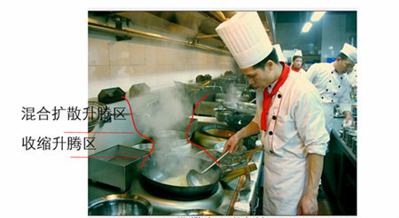我必須告訴你,能吸住鐵鍋的油煙機不能吸凈油煙!因為吸油煙機的吸油煙能力和其吸風口與油煙產生源之間距離的平方成反比(可以用數學公式證明)!同時,油煙離開鍋具越遠,擴散越厲害(如下圖),吸干凈的難度越大。