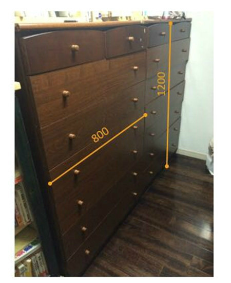 補充一下多屜柜,日文是簞笥,類似于中國老款式的衣櫥,收納效率非常高,在日本也很受婦女喜愛(笑)。如果是用好的木材的話,價格相當不菲。樣子和尺寸大概是這樣的: