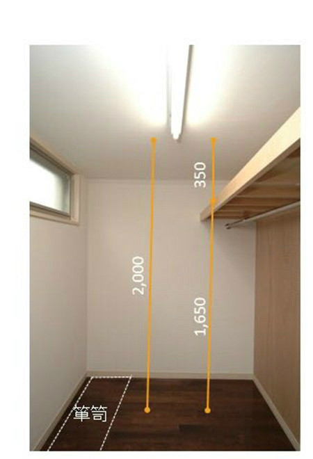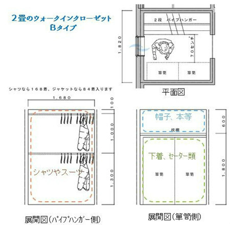 同樣的空間,也可采用一邊掛衣物一邊設置多屜柜(圖中簞笥的部分)的分類方式。