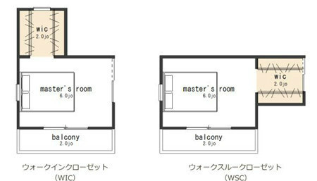 如上圖左就是一個“步入式”的空間,而右圖則是將其作為進入臥室的前室來處理,兩者的差別就在于是否貫穿。早晨起床后能夠在穿過衣帽間的過程中拿取衣物,相對第一種模式來說能夠大大縮短早上找衣服的時間。但是這種貫穿的模式需要增加衣帽間的通道。
