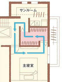 衣帽間的出入口在主寢室和走廊各設置一個,形成貫穿式,并且,“洗衣”“干衣”“折疊”“熨燙”的家務空間集成在北邊的家務間里,更方便了這一系列的家務動線。