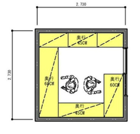這是一個標準的3平米衣帽間。存放衣物的柜子寬度為600mm,采用中間走道兩邊衣櫥的布局,可以簡單計算得到室內有效的小寬度大約需要1.8米。在這里600mm的走道僅能容納人站立走動,想要在里面換衣服神馬的基本是不可行的。