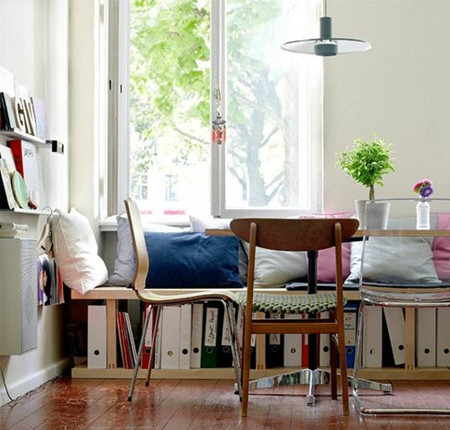 同樣是一個架子,如果你的飄窗位置只是一個高度在不到三十公分的高臺,那他還有成為帶有儲物功能的辦公臺的功用。