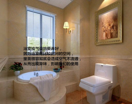 浴室的換氣設(shè)施一定要弄好,因為浴室是比較封閉的空間,里面很容易就會造成空氣不流通,從而出現(xiàn)異味,影響我們的使用,所以對浴室按裝良好的換氣設(shè)備非常重要,平時要注意經(jīng)常打開窗換換氣,這樣有利于空氣的流通,如果把熱水器裝在浴室間內(nèi),那么通風(fēng)就顯得更加重要了。