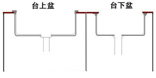 臺上盆搭在臺面上,臺下盆粘在臺面下。