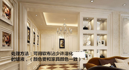 處理方法:如果家具不小心被刮傷,但未觸及漆膜以下的木質,可用軟布沾少許溶化的蠟液(顏色要和家具顏色一致),涂在漆膜傷處,覆蓋傷痕。待蠟質變硬后,再涂一次,如此反復多涂幾次,即可將其膜傷痕掩蓋。