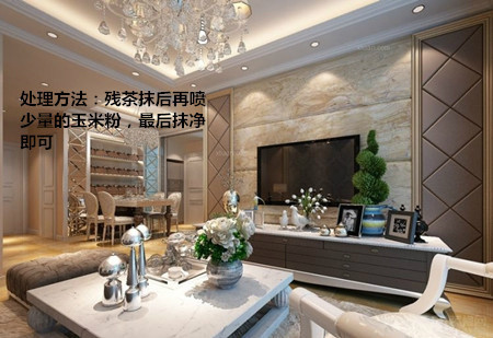 處理方法:殘茶是極好的清潔劑,抹后再噴少量的玉米粉進行抹試,后將玉米粉抹凈即可。玉米粉能吸收所有吸附在家具表面的臟物,使漆面光滑明亮。
