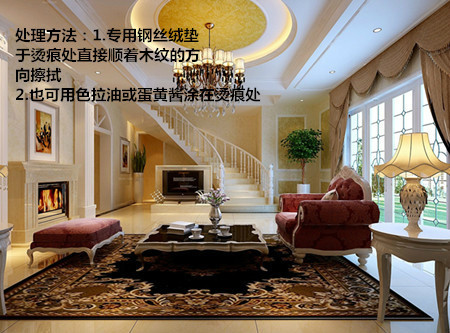 處理方法:用一塊干燥的、超細的家具涂裝專用鋼絲絨墊于燙痕處直接順著木紋的方向擦拭,也可用色拉油或蛋黃醬涂在燙痕處,取軟布順木紋輕輕擦拭,然后再換一塊清潔的軟布將其擦干凈,后上光。煙頭或未熄滅的火柴在家具漆面留下焦痕,若是漆面燒灼,可在火柴桿或牙簽上包一層細紋硬布,輕輕擦抹痕跡,然后涂上一層薄蠟,焦痕即可淡化。