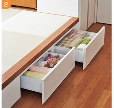 這點(diǎn)已經(jīng)非常普及了。如果家里有日式榻榻米的話不妨嘗試,收納能力非常強(qiáng)。需要注意的是如果設(shè)置抽屜的話,對(duì)于榻榻米的結(jié)構(gòu)需要加強(qiáng),否則荷載導(dǎo)致變形的話抽屜會(huì)有打不開(kāi)的風(fēng)險(xiǎn)。
