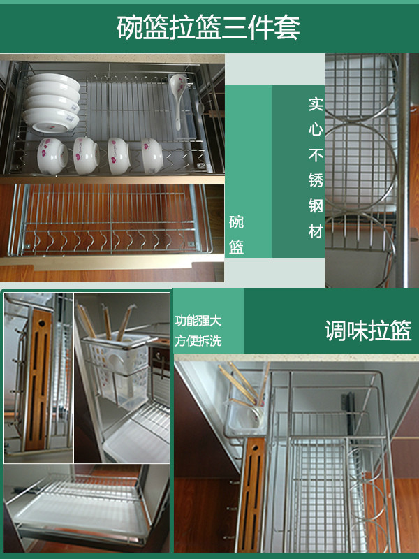 柜體平安樹實木多層板(桉木芯E0級),臺面石英石(單色),品牌圓管不銹鋼拉籃,碗籃,調味籃,品牌不銹鋼阻尼鉸鏈,拉手(樣式可自選)三組海蒂詩導軌抽屜。